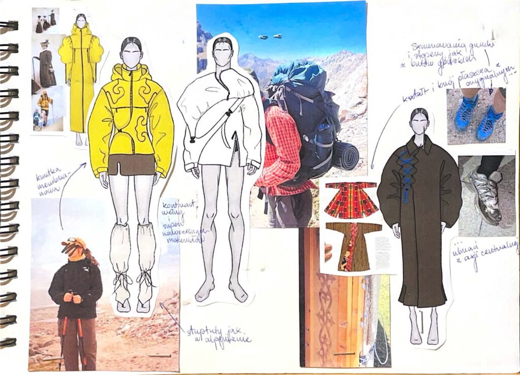 Proces ten można podzielić na dwa etapy. Wizualnych inspiracji naturą, z której przeniosłam kolory. W mojej kolekcji są błękity kojarzące się z niebem, dużo bieli i szarości przywołujących surowy, górski krajobraz i kamienie. Nie brakuje też, rzecz jasna, zieleni. Równolegle przebiegał proces inspiracji odzieżą. Były to zapięcia plecaka, kijki trekkingowe i po prostu rzeczy, które towarzyszyły nam codziennie. Jednocześnie moją uwagę nieustannie przyciągały tamtejsze tradycje i folklor, a zatem przede wszystkim wełny i filce. Stanowiło to bardzo duży kontrast wizualny – membrana w odzieży sportowej i wełniany filc.